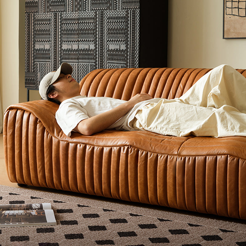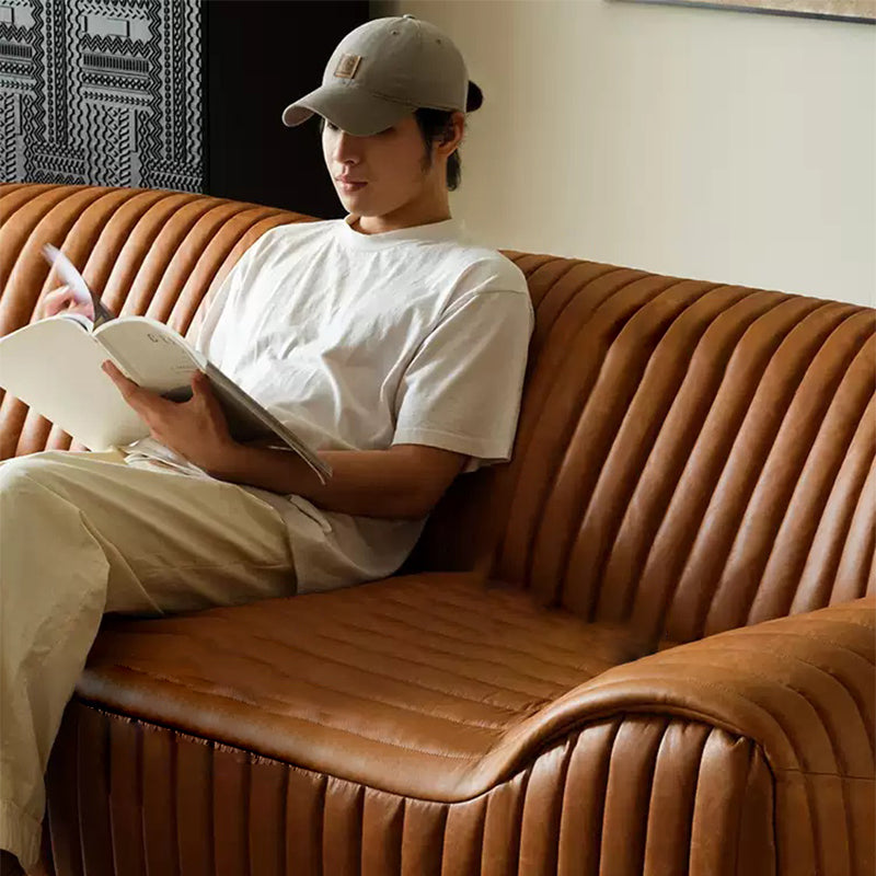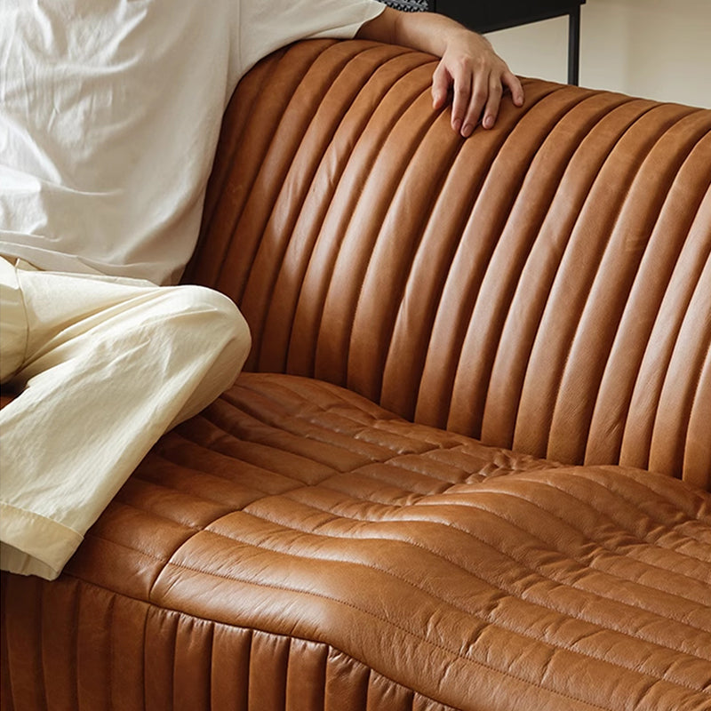 The Onda sofa is a sculptural tribute to contemporary design—where form flows with function. Dressed in rich, full-grain leather, its surface is shaped with rhythmic vertical pleats inspired by the keys of a piano, creating a bold, architectural rhythm across its body. The wave-like contour of the seat invites you into a soft, enveloping embrace—sophisticated yet deeply comfortable.